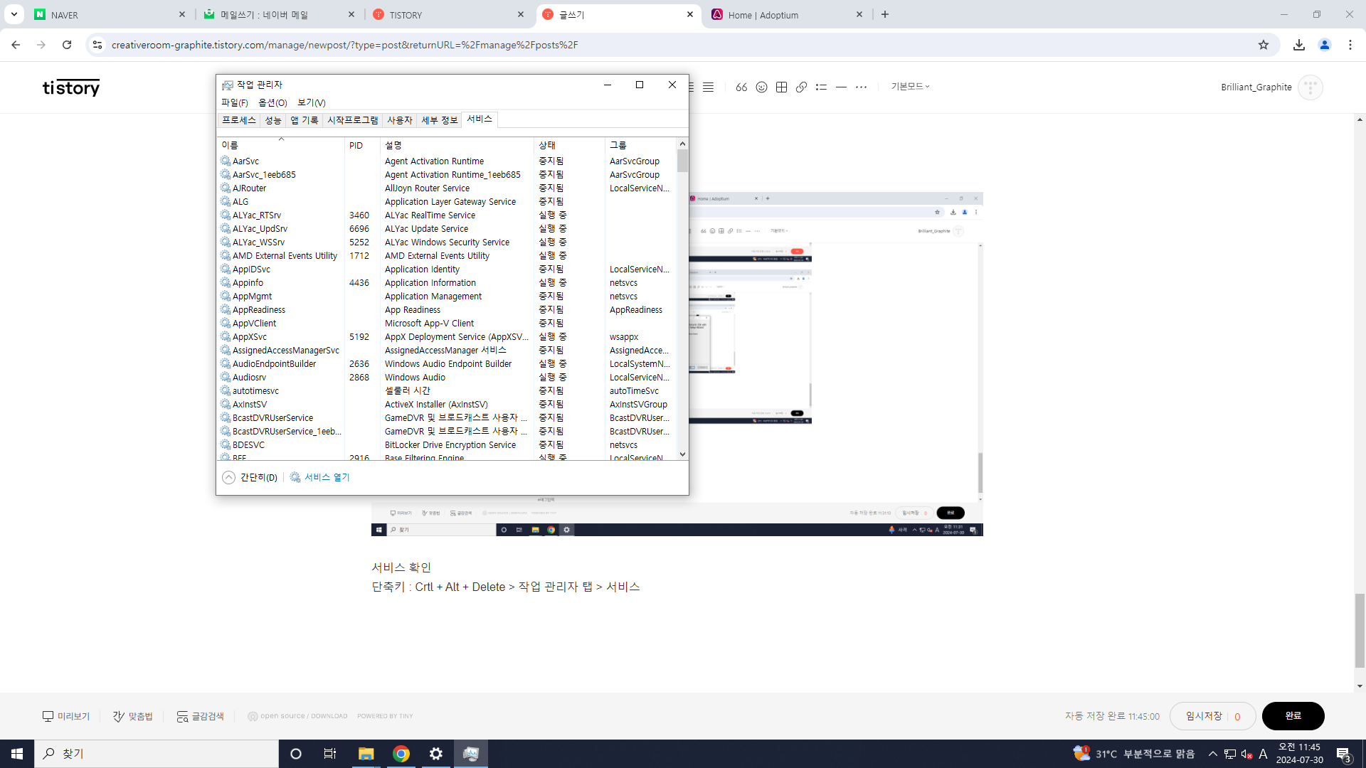 단축키 : Ctrl + Alt + Delete > 작업 관리자 탭 > 서비스